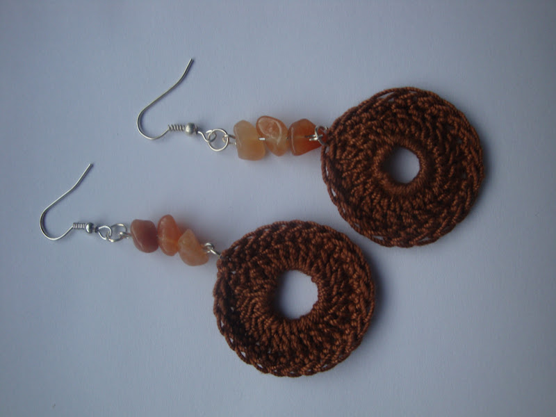 Cercei realizati din chipsuri de carneol si discuri crosetate din bumbac maro.