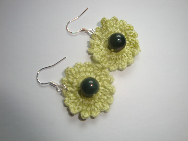Cercei realizati dintr-o floare crosetata din bumbac verde deschis si aplicatii din agate indiene de culoare verde.