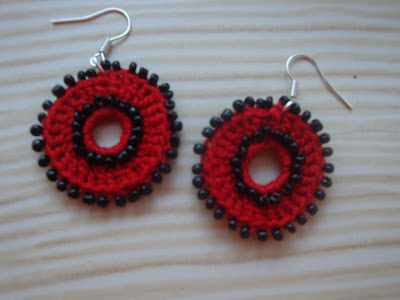 Cercei realizati dintr-o baza crosetata din bumbac rosu cu aplicatii din margele metalice.