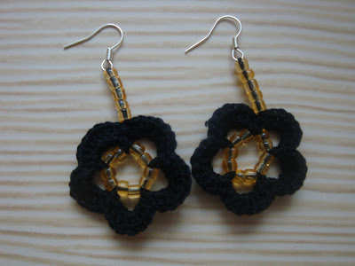 Cercei realizati din bumbac negru si margele de culoarea mierii.