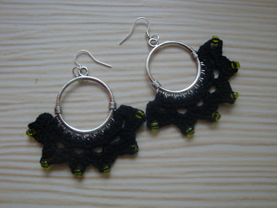 Cercei realizati din bumbac negru si margele verde smarald.