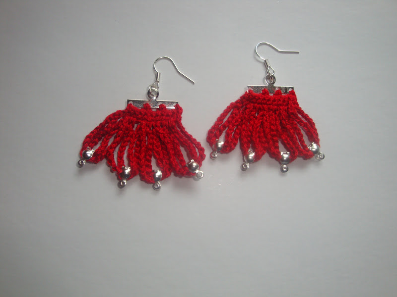Cercei realizati dintr-o baza metalica si o margine croseta din bumbac rosu.