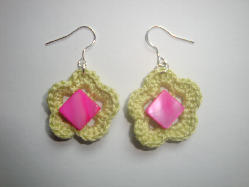 Cercei realizati dintr-o floare crosetata din bumbac verde deschis si aplicatii de sidef patrat de culoare roz.